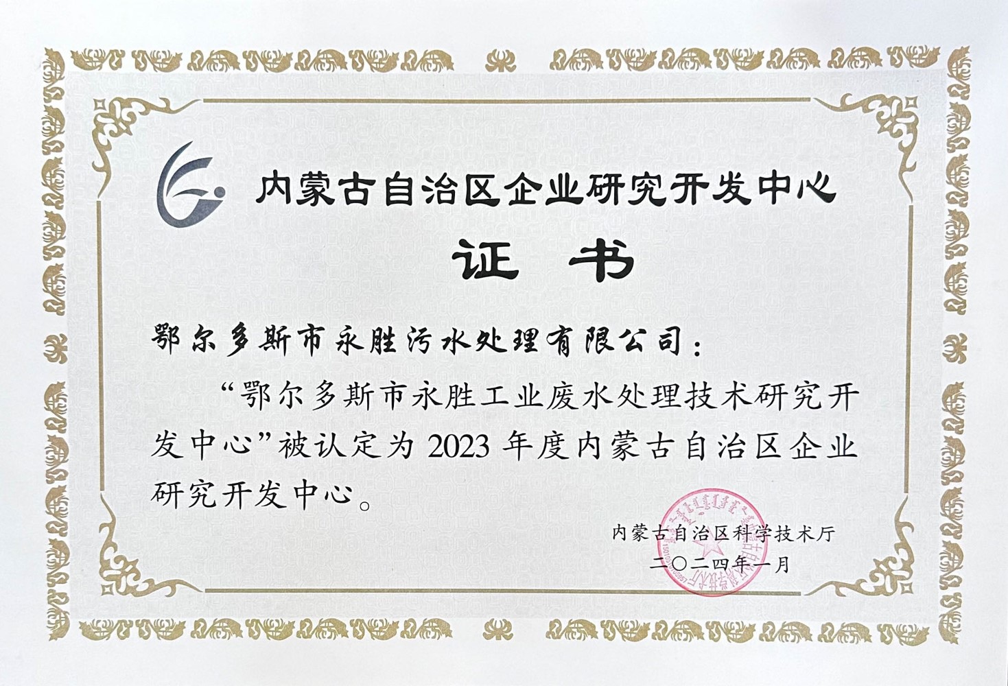 鄂爾多斯市永勝污水處理公司被認(rèn)定為2023年度內(nèi)蒙古自治區(qū)企業(yè)研究開發(fā)中心