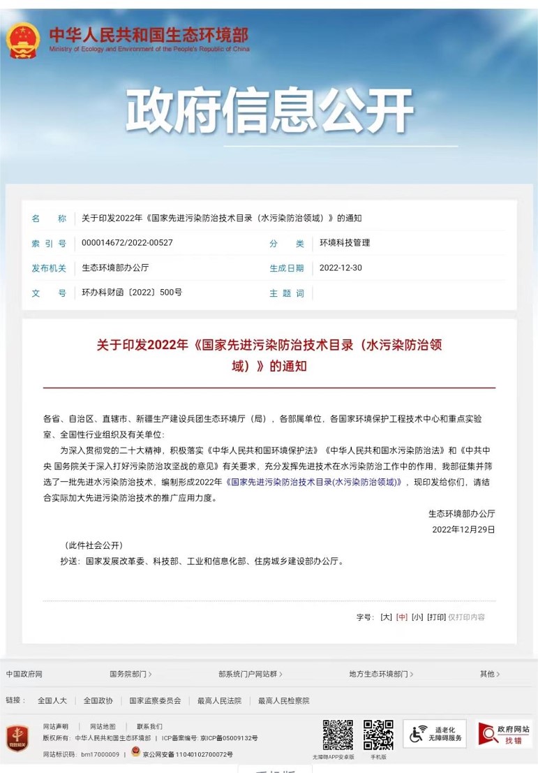 核心技術(shù)“氯堿工業(yè)廢水非蒸發(fā)結(jié)晶資源化技術(shù)”被國家生態(tài)環(huán)境部收納至2022 年《國家先進污染防治技術(shù)目錄(水污染防治領(lǐng)域)》作為示范技術(shù)在全國推廣應(yīng)用